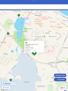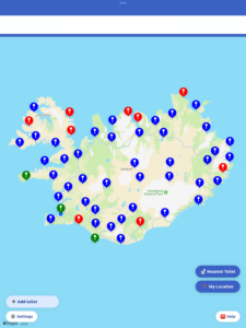 🚽 Næsta opna salerni– Smelltu á hnappinn [Næsta salerni]. Þá leitar appið að næsta salerni sem er opið. Það mun ekki stinga upp á salerni sem er lokað.
